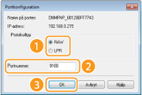 Klicka på alternativknappen [LPR] eller [RAW] i [Protokolltyp], ändra eventuellt numret i textrutan [Portnummer] och klicka sedan på [OK].