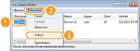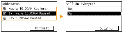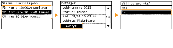 Avbryta från gränssnittet för fjärranvändningDu kan avbryta utskriften från sidan [Jobbstatus] i Fjärranvändargränssnittet: Kontrollera aktuell status för utskriftsdokument