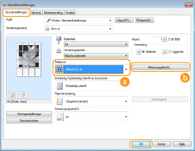 Affischstorleksinställningar kan inte väljas när dubbelsidig utskrift är aktiverad. Välj [Enkelsidig utskrift] i [Enkelsidig/dubbelsidig/utskrift av broschyrer] och ange sedan ett posterformat.