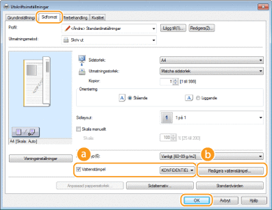 Du kan skriva ut vattenstämplar, till exempel "KOPIA" eller "KONFIDENTIELL", över dokumentet. Du kan skapa nya eller använda förregistrerade vattenstämplar.