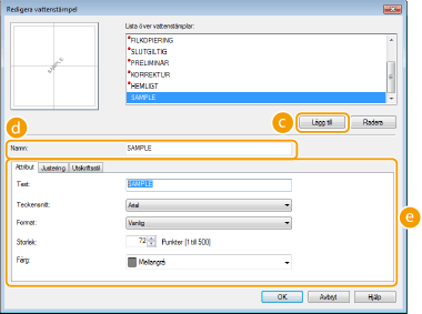 Klicka på flikarna för att ange text, färg eller vattenstämpelns placering. Mer information får du om du klickar på [Hjälp] på skrivardrivrutinsskärmen.