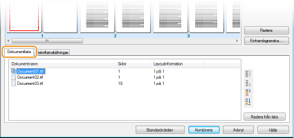 Klicka på fliken [Dokumentlista] för att visa de dokument som lagts till i steg 1 till 4. Du kan ta bort dokument genom att välja dem i listan och klicka på [Radera från lista].