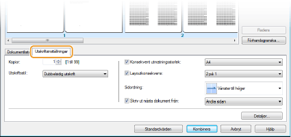 Klicka på fliken [Utskriftsinställningar] för att visa den skärm där du anger utskriftsinställningar, till exempel antal kopior och enkelsidig/dubbelsidig utskrift. Inställningar som görs här används på hela utskriftsjobbet.
