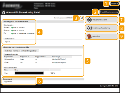 Visar aktuell status för enheten samt felinformation. Om ett fel inträffar visas länken till felinformationssidan.