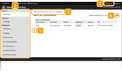 Visar status för aktuella utskriftsdokument samt historik över utskrift, kopiering, avsända och mottagna dokument. Du kan även kontrollera enhetens status.
