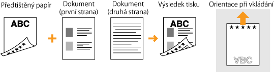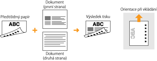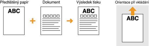 Tato část popisuje způsob vložení předtištěného papíru správnou stranou nahoru a ve správné orientaci. Popis obecného postupu vkládání papíru do zásuvky na papír nebo do otvoru podavače pro ruční podávání naleznete v části Vkládání papíru do zásuvky na papír nebo Vkládání papíru do podavače pro ruční podávání.