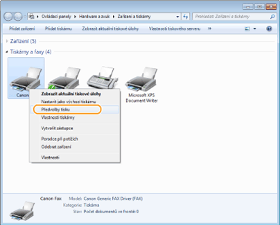 Klikněte pravým tlačítkem na ikonu faxového ovladače pro dané zařízení a klikněte na možnost [Předvolby tisku].