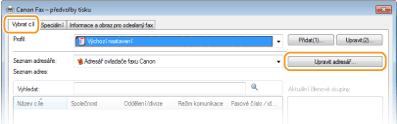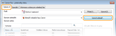 Tato část popisuje způsob registrace míst určení do adresáře pro faxování z počítače. Jednotlivá místa určení uložená v adresáři je možné vybrat a použít k vytvoření jednoho skupinového místa určení (Skupinové vytáčení). Tuto skupinu lze využít při hromadném odesílání do více míst určení.