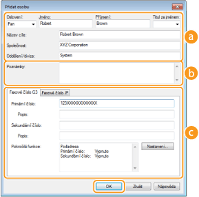 Zadejte faxové číslo nebo čísla. Podle potřeby je možné mezi čísla zadávat pomlčky. Pokud chcete přidat vysvětlivku týkající se použití faxových čísel, např. „Domů“ nebo „Kancelář“, zadejte ji do pole [Popis].