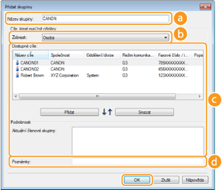 Pro vymazání místa určení z [Aktuální členové skupiny], vyberte místo určení, které chcete odstranit, a stiskněte tlačítko [Smazat].