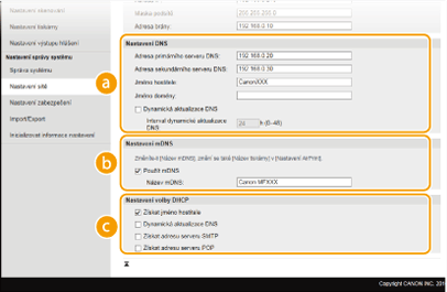 mDNS (multicast DNS) je protokol přijatý službou Bonjour, který slouží k přiřazení názvu hostitele k IP adrese bez použití systému DNS. Chcete-li funkci mDNS povolit, zaškrtněte políčko a zadejte název mDNS do textového pole [Název mDNS]. [Nastavení volby DHCP][Získat jméno hostitele]