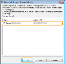 Je nutné, aby bylo zařízení propojené s počítačem a aby byl nainstalovaný veškerý software. Další informace týkající se této kontroly naleznete v příručce „Instalační příručka pro ovladač MF“. Chcete-li se připojit přes bezdrátovou nebo kabelovou síť LAN, je nutné toto zařízení zaregistrovat v nástroji MF Network Scanner Selector. Registraci proveďte podle následujícího postupu. Tento postup není nutný, je-li zařízení propojené s počítačem přes rozhraní USB.