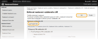 Použití ovládacího paneluPomocí možnosti <Nabídka> na obrazovce <Domů> také můžete povolit nebo zakázat komunikaci šifrovanou pomocí protokolu TLS. Použít TLS