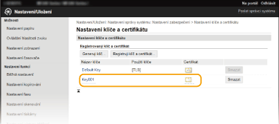 Pár klíčů nelze smazat, jestliže je z nějakého důvodu aktuálně používán, např. když je položka „[TLS]“ nebo „[IEEE 802.1X]“ zobrazena v části [Použití klíče]. V takovém případě je před smazáním nutné příslušnou funkci zakázat nebo vyměnit.
