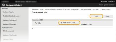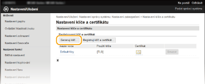 Pokud šifrovaná komunikace vedená prostřednictvím protokolu TLS (Transport Layer Security) vyžaduje pár klíčů, je možné ho pomocí zařízení vygenerovat. K přístupu k zařízení přes Vzdálené uživatelské rozhraní lze použít funkci TLS. Pro zařízení je možné vygenerovat až pět párů klíčů (včetně předinstalovaných párů). Certifikáty podepsané svým držitelem jsou používány s páry klíčů vygenerovanými pomocí možnosti „Komunikace v síti“. Pomocí možnosti „Klíč a žádost o podepsání certifikátu (CSR)“ můžete požádat o digitální certifikát od certifikační autority pro pár klíčů vygenerovaný zařízením.
