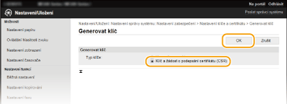 Vyberte možnost [Klíč a žádost o podepsání certifikátu (CSR)] a klikněte na tlačítko [OK].