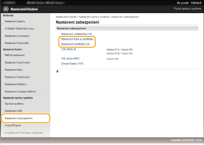 [Nastavení klíče a certifikátu] nebo [Nastavení certifikátu CA].
