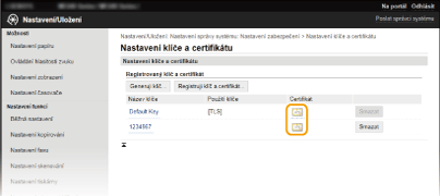 Kliknutím na možnost [Nastavení klíče a certifikátu] ověřte pár klíčů. Kliknutím na možnost [Nastavení certifikátu CA] ověřte certifikát CA.