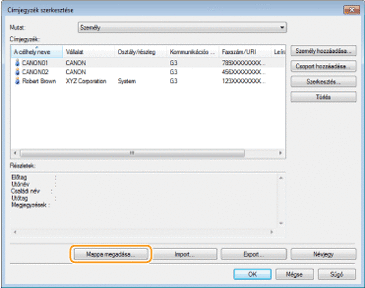 Ha a számítógéppel küldött faxok gyakran használt rendeltetési helyeit bejegyzi a címjegyzékbe, akkor könnyedén megadhatja ezeket, amikor számítógépről küld faxokat. A Microsoft Excelben vagy hasonló alkalmazásban ráadásul létrehozhat egy CSV-formátumú fájlt, amelybe bejegyezheti a címadatokat, majd importálhatja a készülékre, a címjegyzék adatait pedig exportálhatja egy fájlba, és felhasználhatja más faxkészülékeken vagy alkalmazásokban.