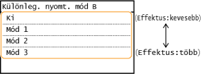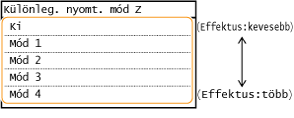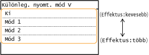 A <Ki> vagy a <Mód 1> érték megadása esetén előfordulhat, hogy a nyomtatott papírra csíkok tapadnak. A <Mód 3> vagy a <Mód 4> érték megadása esetén előfordulhat, hogy a körvonalak elmosódnak vagy a képek némileg szemcsésen jelennek meg. A nyomtatási fedettség világosabbá válik a beállításnak a <Ki> értékről a <Mód 4> felé történő haladásával.