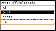 ![]() ![]() Ha nem DHCP/BOOTP/RARP protokollal kívánja kiosztani az IP-címeket Válassza a <Ki> lehetőséget. Ha a <DHCP>, <BOOTP>, vagy <RARP> lehetőséget választja, de a megfelelő szolgáltatás nem érhető el, akkor a készülék fölöslegesen fordít időt és kommunikációs erőforrásokat az adott szolgáltatás hálózaton történő keresésére. |