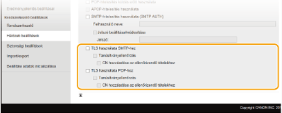 Az SMTP-kiszolgálóval folytatott kommunikáció TLS protokollal történő titkosításához jelölje be a jelölőnégyzetet. Igény szerint jelölje be a [Tanúsítványellenőrzés] vagy [CN hozzáadása az ellenőrizendő tételekhez] jelölőnégyzetet.
