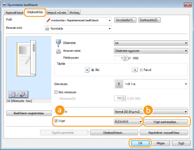 Az egyes fülekre kattintva beállíthatja a vízjel szövegét, színét és nyomtatási pozícióját. A további tudnivalókért kattintson a nyomtató-illesztőprogram [Súgó] menüpontjára.