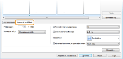 A [Nyomtatás beállítások] fülre kattintva megjelenítheti a nyomtatási beállítások, például a példányszám vagy az egy- és kétoldalas nyomtatás beállítására szolgáló képernyőt. Az itt megadott beállítások a teljes nyomtatási feladatra érvényesek.