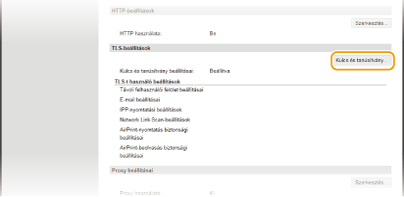 A Távoli felhasználói felület indítása TLS protokollalHa úgy próbálja meg elindítani a Távoli felhasználói felületet, hogy engedélyezve van a TLS, akkor egy biztonsági tanúsítványra vonatkozó riasztás jelenhet meg. Ebben az esetben ellenőrizze, hogy a helyes URL-címet adta-e meg a címsorban, majd jelenítse meg a Távoli felhasználói felület képernyőjét. A Távoli felhasználói felület indítása
