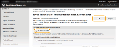 A kezelőpanel használatávalA TLS titkosítású kommunikáció engedélyezése és tiltása a <Menü> opcióval történik a <Főképernyő> felületén. TLS használata