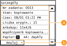 Zostaną wyświetlone: liczba kopii, ustawienia oraz inne informacje. Aby sprawdzić szczegóły kopiowania bez anulowania czynności, naciśnij przycisk