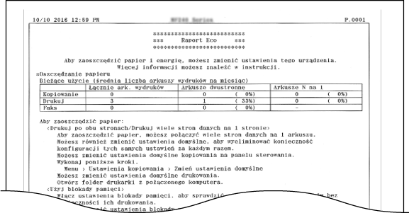 Można sprawdzić informacje takie jak liczba wydruków na miesiąc oraz ilość zużytej energii, a także poznać sposoby zwiększenia oszczędności.