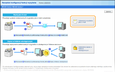 Narzędzie Narzędzie do ustawiania funkcji wysyłania pomoże skonfigurować podstawowe ustawienia wysyłania wiadomości e-mail. Zamiast narzędzia Narzędzie do ustawiania funkcji wysyłania można użyć Zdalnego interfejsu użytkownika, aby skonfigurować bardziej szczegółowe ustawienia, takie jak uwierzytelnianie POP przed wysłaniem lub szyfrowanie komunikacji. Konfigurowanie ustawień komunikacji poczty e-mail
