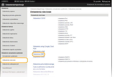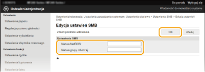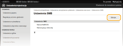 Blok komunikatów serwera (SMB) to protokół umożliwiający udostępnianie zasobów, takich jak pliki i drukarki, kilku urządzeniom w sieci. Urządzenie używa protokołu SMB do przechowywania zeskanowanych dokumentów w folderze udostępnionym. W zależności od sieci konieczne może być określenie nazwy NetBIOS i nazwy grupy roboczej.