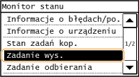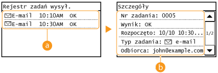 ![]() <Rejestr zadań wysył.>Wyświetlanie listy dokumentów, które zostały wysłane. Komunikat <OK> jest wyświetlany po pomyślnym wysłaniu dokumentu. Jeżeli natomiast wysłanie dokumentu nie powiedzie się, ponieważ zostało anulowane lub wystąpił błąd, na ekranie pojawi się komunikat <Błąd>.