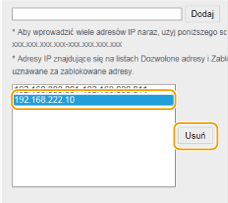Ogranicza komunikację (odbiór) z urządzeniami o adresach IP wprowadzonych w polu [Adres do zarejestrowania]. Komunikacja z urządzeniami o innych adresach IP jest dozwolona.