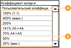 Можно увеличить или уменьшить размер копий, используя предварительно заданный коэффициент масштабирования при копировании, например <A5->A4>, или выбрав настраиваемый коэффициент масштабирования с шагом 1 %.