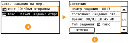 ![]() <Сост. задания на пер.>/<Сост./жур.зад.пр.факса>Отображение списка документов, отправляемых, принимаемых или ожидающих обработки.