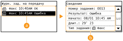 ![]() <Журн. зад. на передачу>/<Жур. зад. на прием фкс>Отображение списка отправленных и принятых документов. При успешной отправке и приеме документа на экран выводится сообщение <OK>, а при сбое отправки или приема документа из-за отмены или ошибки отображается сообщение <Ошибка>.