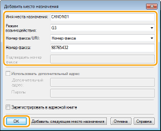 Задайте режим взаимодействия и номер факса (либо URI), затем нажмите [ОК].