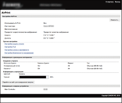 Можно отобразить экран AirPrint, с помощью которого можно не только получить доступ к параметрам AirPrint, но и просматривать информацию о расходных материалах, например бумаге и картридже с тонером. Кроме того, можно настраивать параметры функций безопасности (
