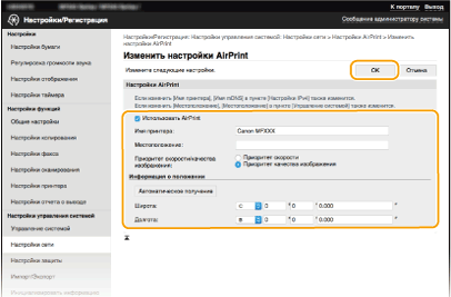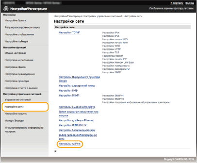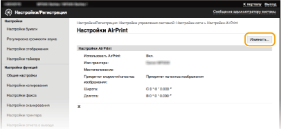 Для изменения настроек AirPrint войдите в систему в режиме администратора системы.