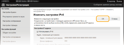 Использование панели управленияПараметры IPv6 также можно настроить через <Меню> на экране <Главный>. Настройки IPv6