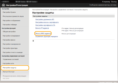 ![]() Проверка на наличие ошибок ввода При неправильном вводе MAC-адресов доступ к аппарату из Удаленного ИП может быть невозможен. В этом случае необходимо установить <Фильтр MAC-адресов> на <Выкл.>. Фильтр MAC-адресов