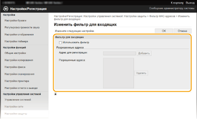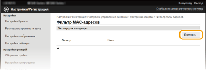 Можно включить или отключить настройки фильтра MAC-адресов в <Меню> на экране <Главный>. Фильтр MAC-адресов