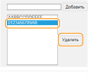 Введите MAC-адрес в текстовое поле [Адрес для регистрации] и щелкните [Добавить]. Разрешает обмен данными (на прием) для устройств с зарегистрированными MAC-адресами и ограничивает обмен данными для устройств с любыми другими MAC-адресами.