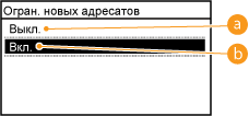 При включении этой функции аппарат запрещает пользователям вводить адресатов, используя цифровые клавиши, добавлять новые записи в адресную книгу и редактировать записи, имеющиеся в адресной книге. |