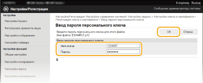 Пары ключей и цифровые сертификаты выдаются центром сертификации (CA) для использования на устройстве. Хранить и регистрировать эти файлы можно, используя Удаленный ИП. Убедитесь, что пара ключей и сертификат соответствуют требованиям аппарата (