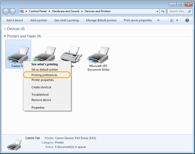 Ar peles labo pogu noklikšķiniet uz faksa draivera ikonas šai iekārtai un noklikšķiniet uz [Printing preferences] (Drukāšanas preferences).