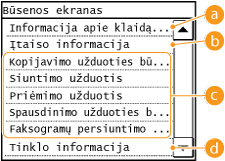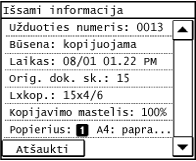 Rodo dabartinę pažymėto elemento būseną. Toliau kaip pavyzdys pateiktas ekranas <Kopijavimo užduoties būsena>.
